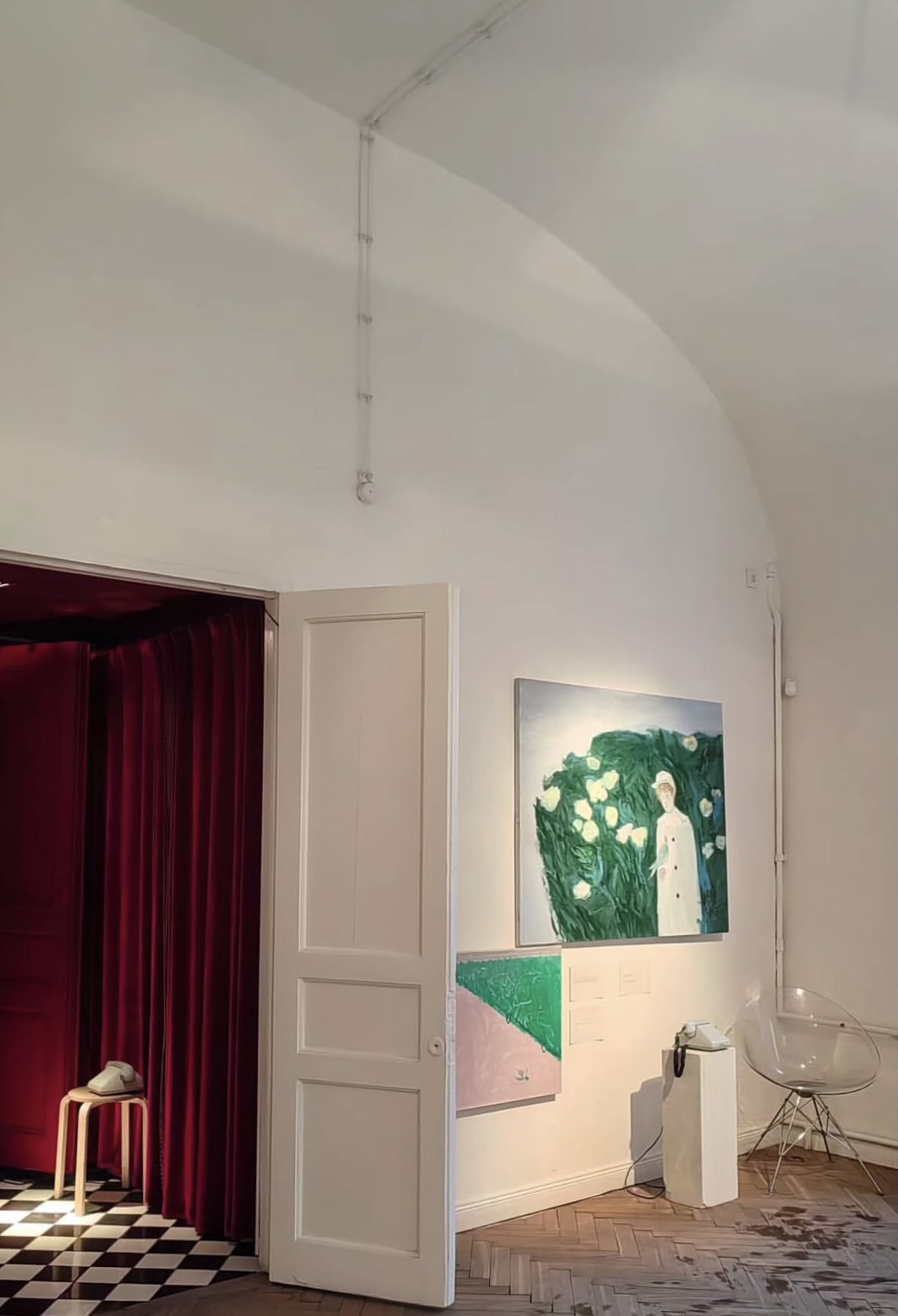 один — в белом зале галереи среди картин рядом с удобным креслом.